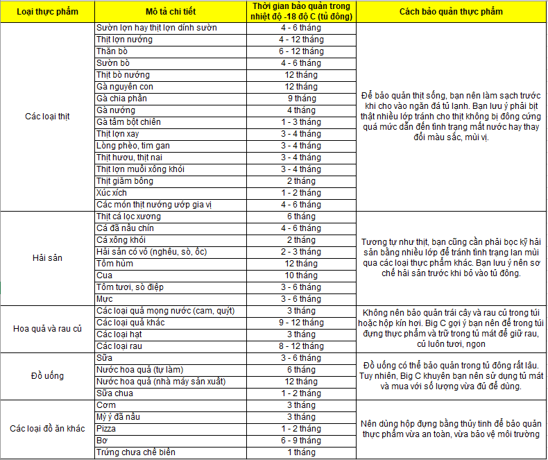 HƯỚNG DẪN THỜI GIAN BẢO QUẢN THỰC PHẨM NGĂN ĐÔNG