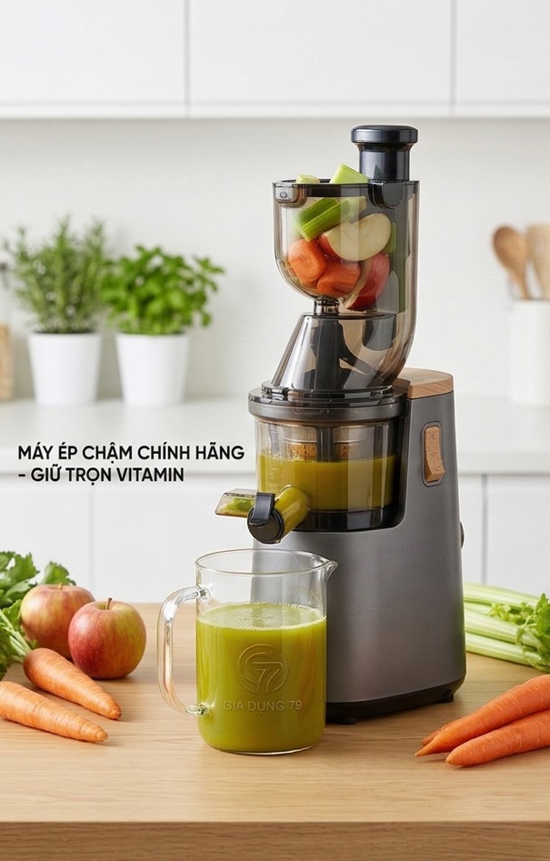 Khác biệt hoàn toàn so với các dòng máy ép ly tâm truyền thống, máy ép chậm sử dụng công nghệ trục vít để nghiền nát trái cây một cách từ tốn, giúp giữ lại tối đa Vitamin, Enzyme và hương vị tự nhiên. Nước ép không bị tách nước, không bị oxy hóa nhanh, giữ được màu sắc tươi tắn. Một ly nước ép nguyên chất mỗi sáng từ thiết bị của Gia Dụng 79 chính là bí quyết cho làn da đẹp, vóc dáng thon gọn và nguồn năng lượng dồi dào cho cả ngày dài.