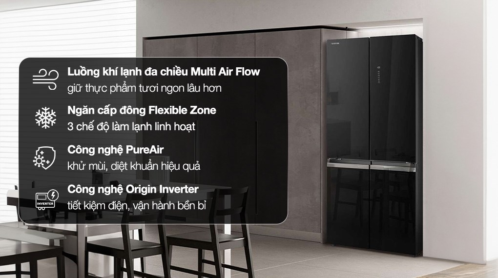 - Tủ lạnh Toshiba được trang bị công nghệ lạnh đa chiều Multi Air Flow giúp hơi lạnh lan tỏa nhanh chóng, đồng đều đến mọi ngóc ngách, giữ thực phẩm luôn tươi ngon, vẹn nguyên dinh dưỡng.