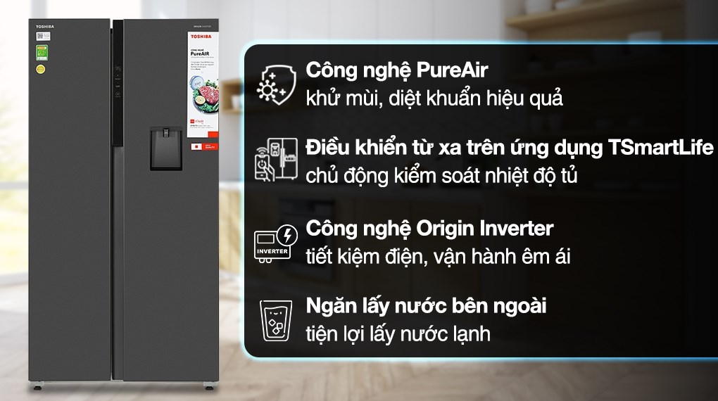 - Toshiba Inverter 596 lít GR-RS775WI-PMV(06)-MG được thiết kế theo kiểu tủ lạnh Side by Side với chất liệu cửa tủ được làm bằng kim loại sơn tĩnh điện 10 lớp có khả năng chống bám vân tay và giảm thiểu tình trạng trầy xước tối ưu.